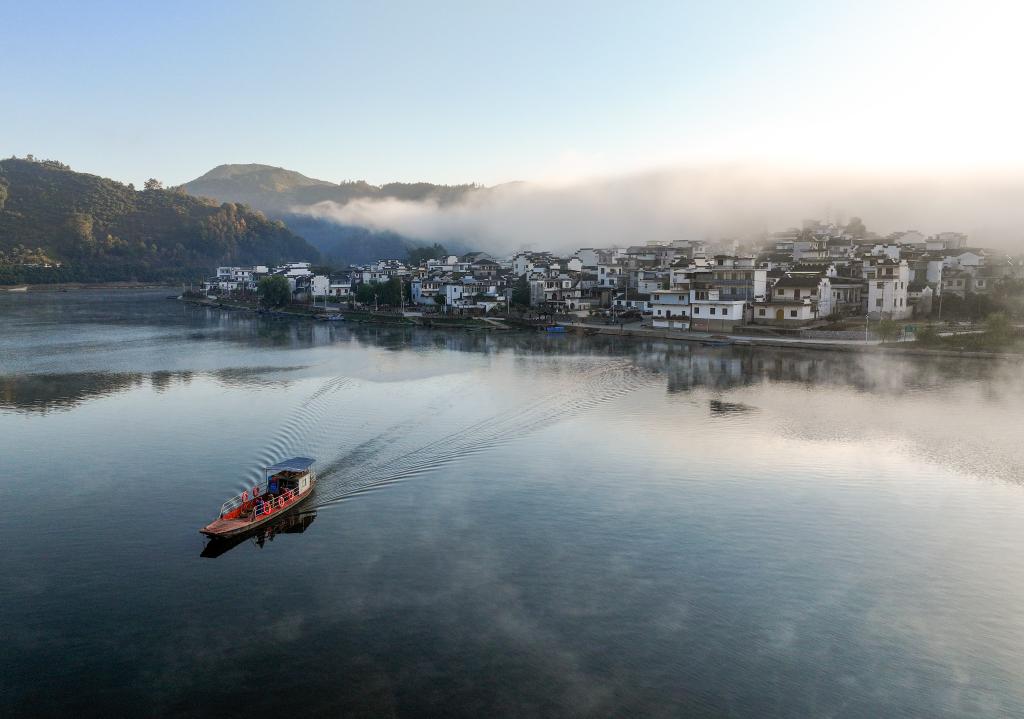 2025年11月15日,安徽省黄山市休宁县商山镇新安江流域出现如梦如幻的晨雾美景。(施亚磊 摄)
