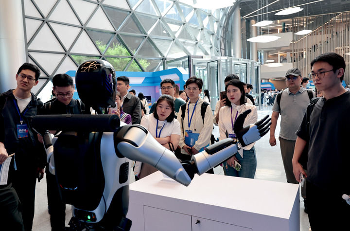 2025年7月29日,智元机器人在进行“才艺”展示,吸引参观者驻足观看。新华社记者 陈浩明 摄
