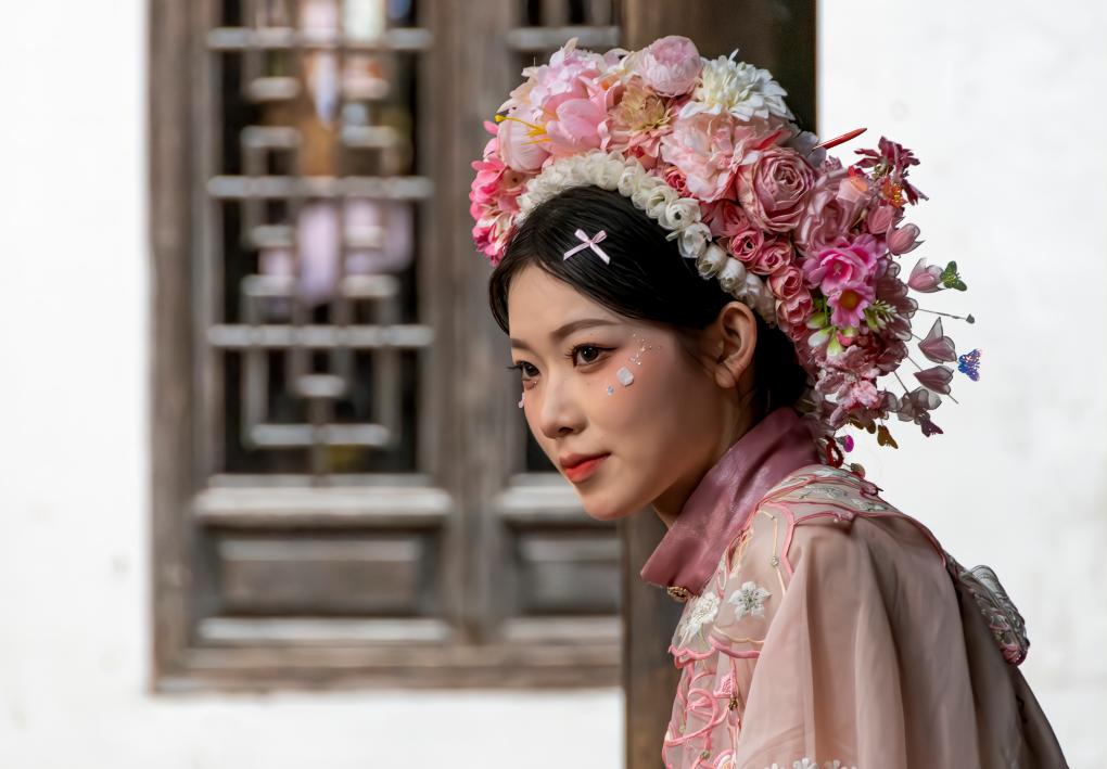 一名游客头戴“簪花”在福州市三坊七巷打卡留影(2月3日摄)。新华社记者魏培全摄