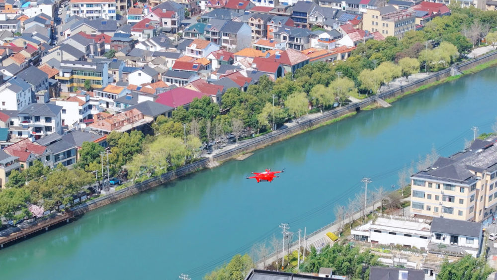低空中,嗡嗡声由远及近,一架无人机缓缓降落在杭州市余杭区黄湖镇青山村的自动收货柜上,它放下餐盒,又“嗖”地腾空而起,准备接下一单。