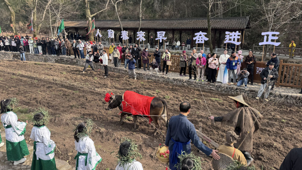 取春泥、舀春水、栽春树……“九华立春祭”市级非遗传承人吴海根在殿前忙碌,他参与立春祭已二十余年。“立春祭可追溯至宋代,仪式中的每一个环节,都蕴藏着江南农耕的根与魂。”吴海根说,2016年,以“九华立春祭”等为代表的中国“二十四节气”被正式列入联合国教科文组织人类非物质文化遗产代表作名录。这道深埋乡野的古老年轮,再次显现出沉淀千年的生命纹路。