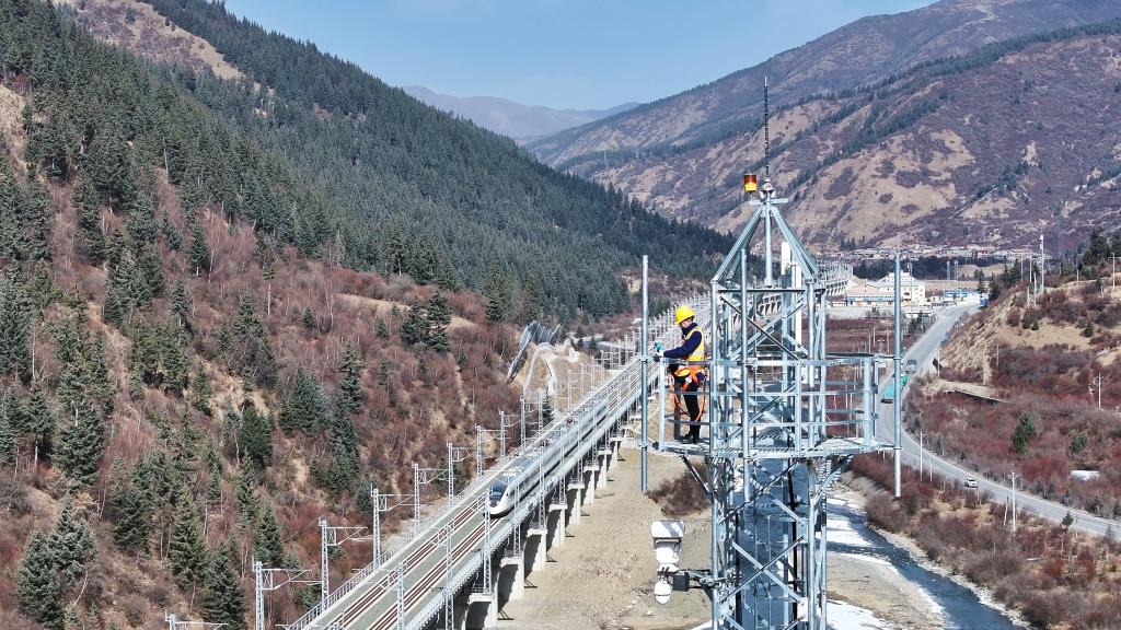 在川青铁路松潘段,宛小冬在铁路通信塔顶进行测试检修。新华社发(张能 摄)