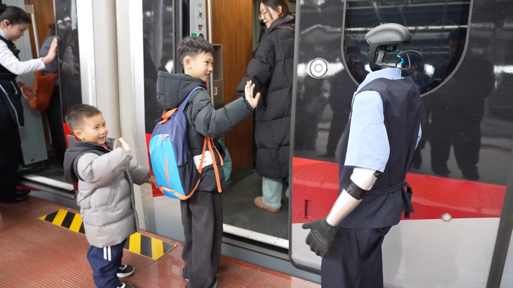 车厢内,身着铁路制服的“福兴”可以与旅客进行打招呼、握手等互动,还能提供出行信息咨询服务,让不少旅客感到惊喜与好奇。