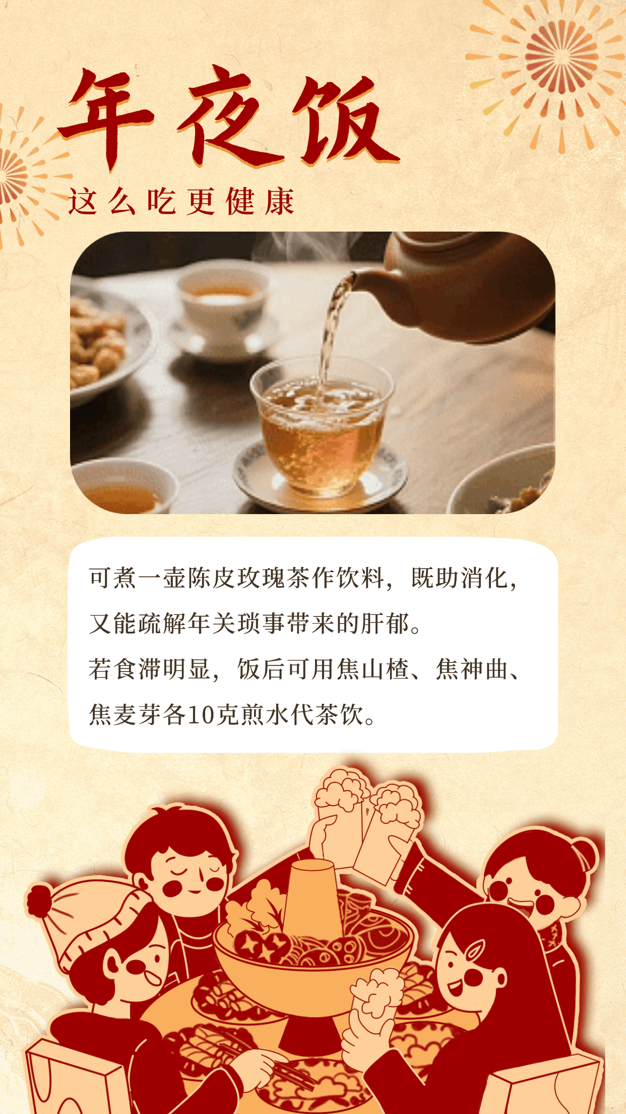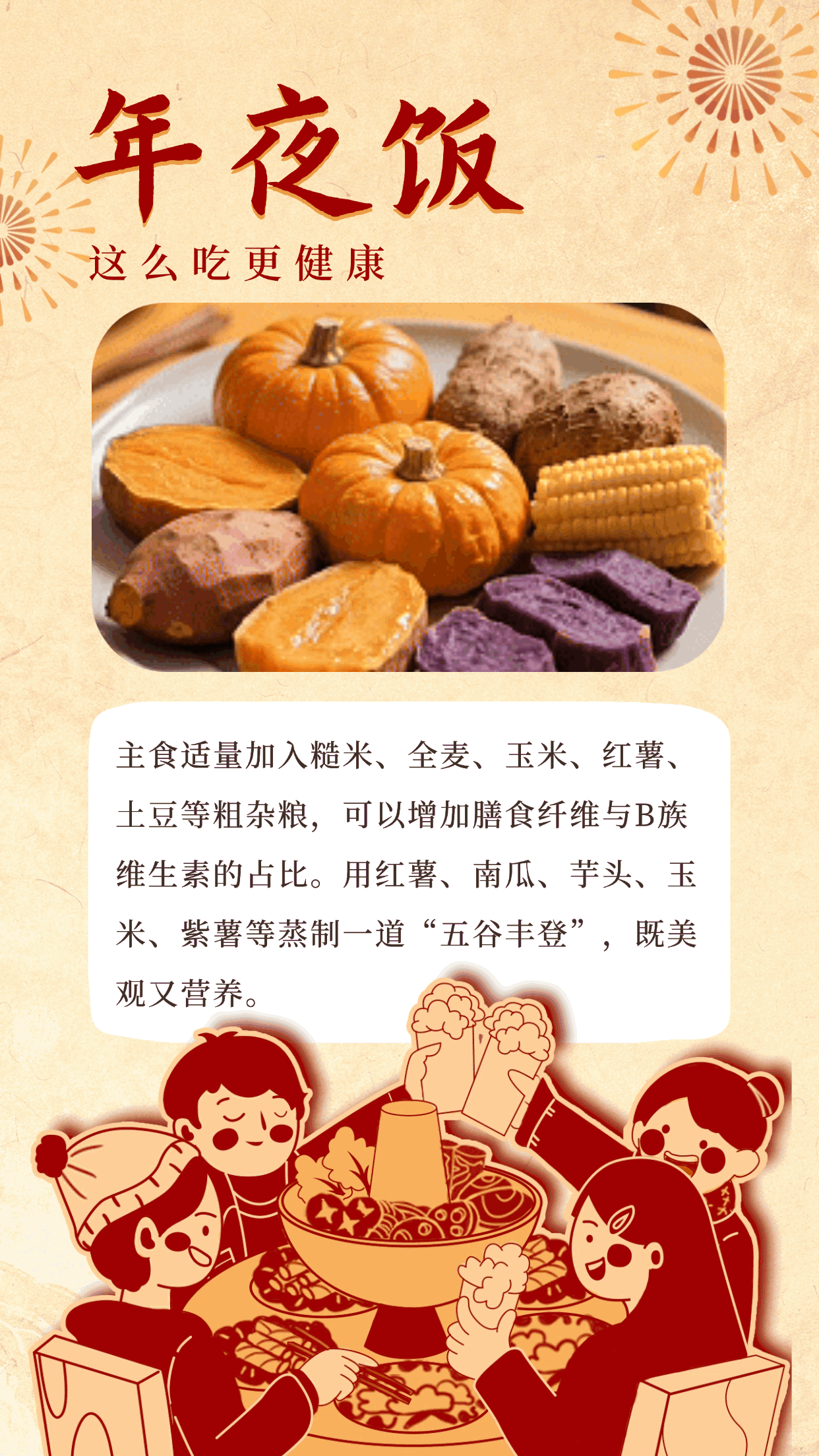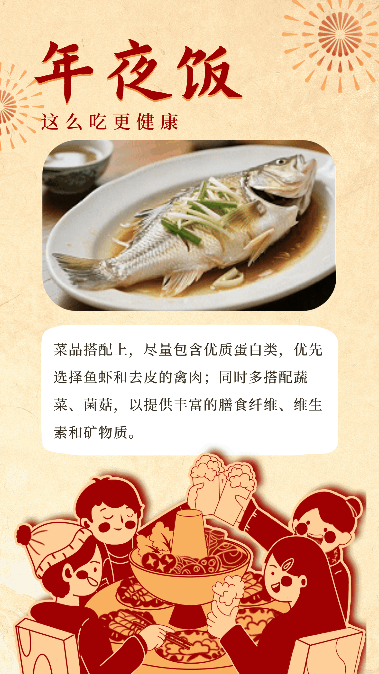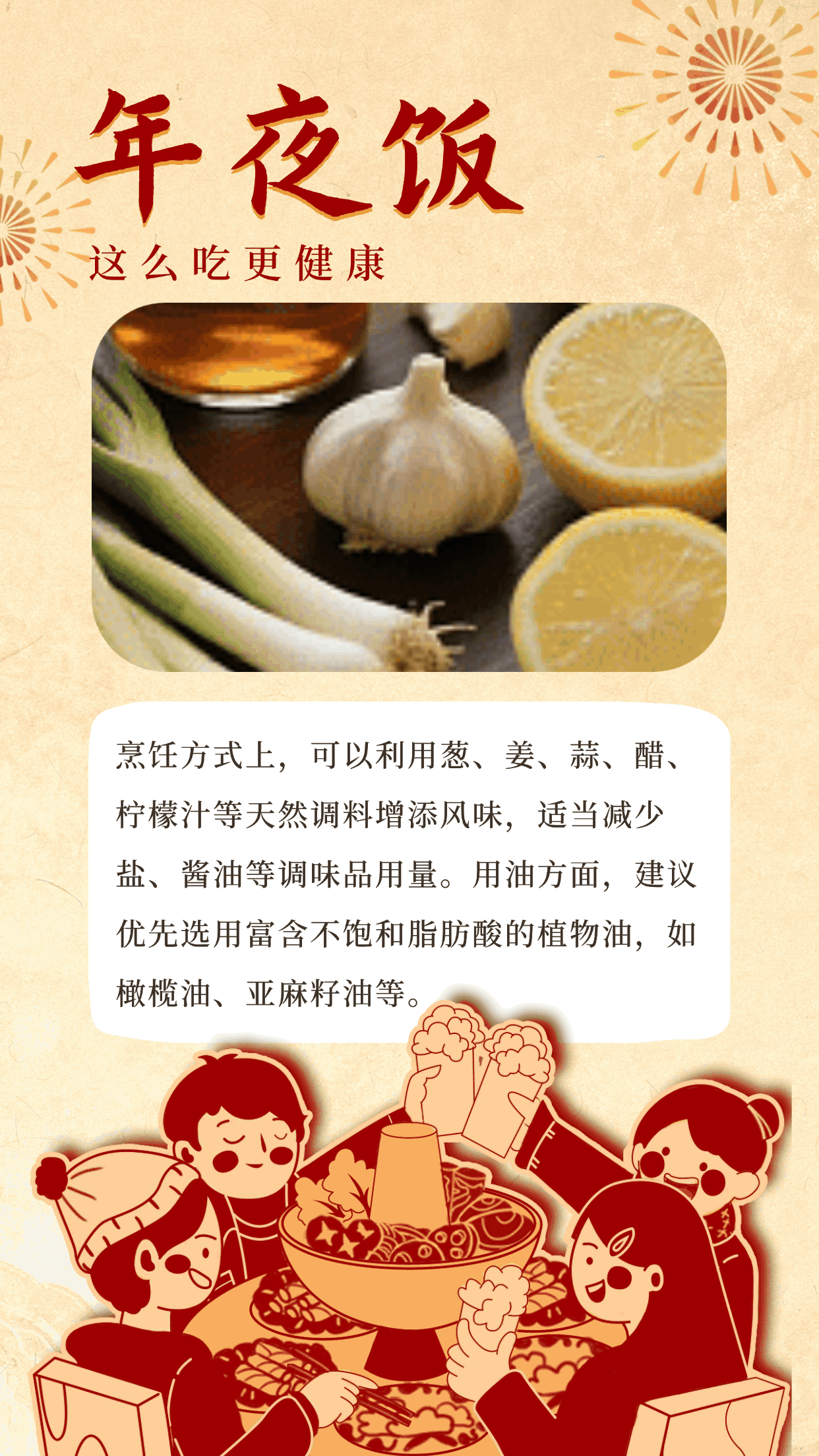 除夕之夜,一桌丰盛的年夜饭承载着团圆的温情和浓浓的年味。如何在尽享美味的同时,吃得更健康?这份“健康锦囊”请查收!