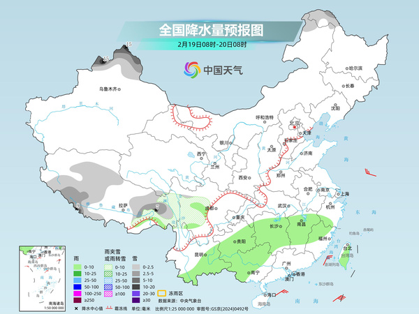 明天,新疆南疆盆地、西藏西部和东南部、青海西部、川西高原北部等地部分地区有小到中雪或雨夹雪。江南西部、西南地区东部、华南北部和西部、台湾岛等地部分地区有小到中雨。