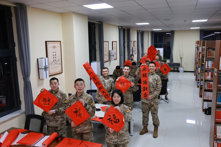 2月14日,火箭军某部官兵在营区内贴福字,布置春节氛围。(何仕儒 摄)