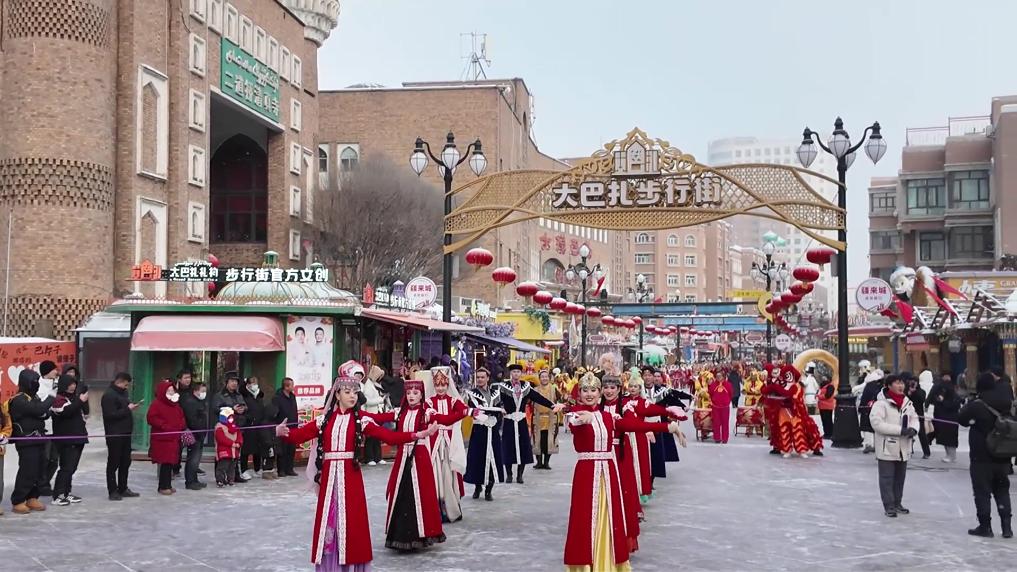 在新疆乌鲁木齐大巴扎景区,火红灯笼与特色建筑相映成趣,处处透着浓浓的年味儿与烟火气。
