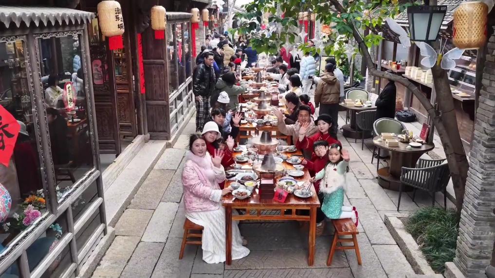春节假期,位于浙江海宁的盐官潮乐之城打造沉浸式年俗体验,古邑街上60余张长桌错落摆开。