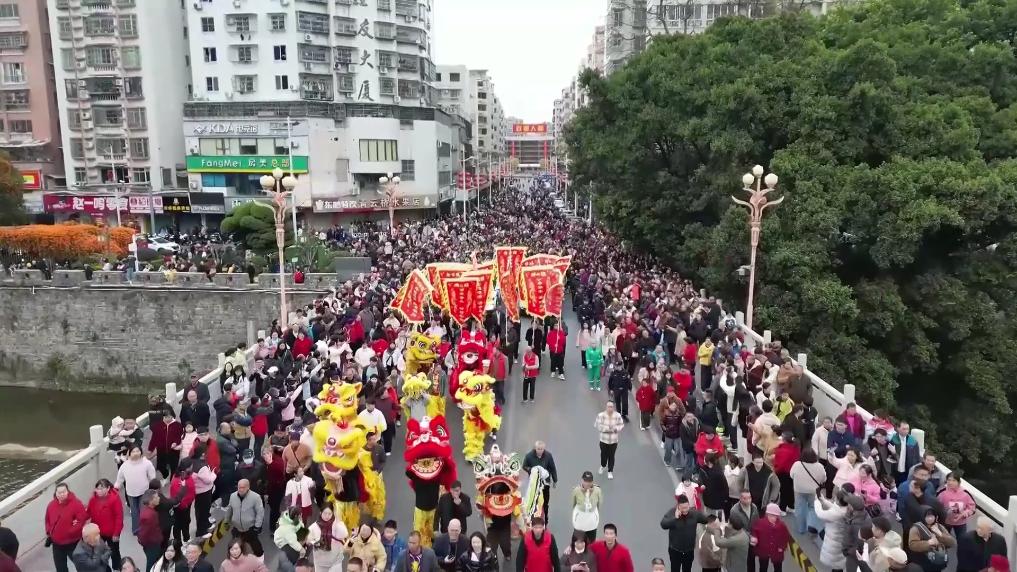 大年初一,广东南雄市“百狮贺新春·非遗耀雄州”非遗巡游在三影塔广场热闹上演。