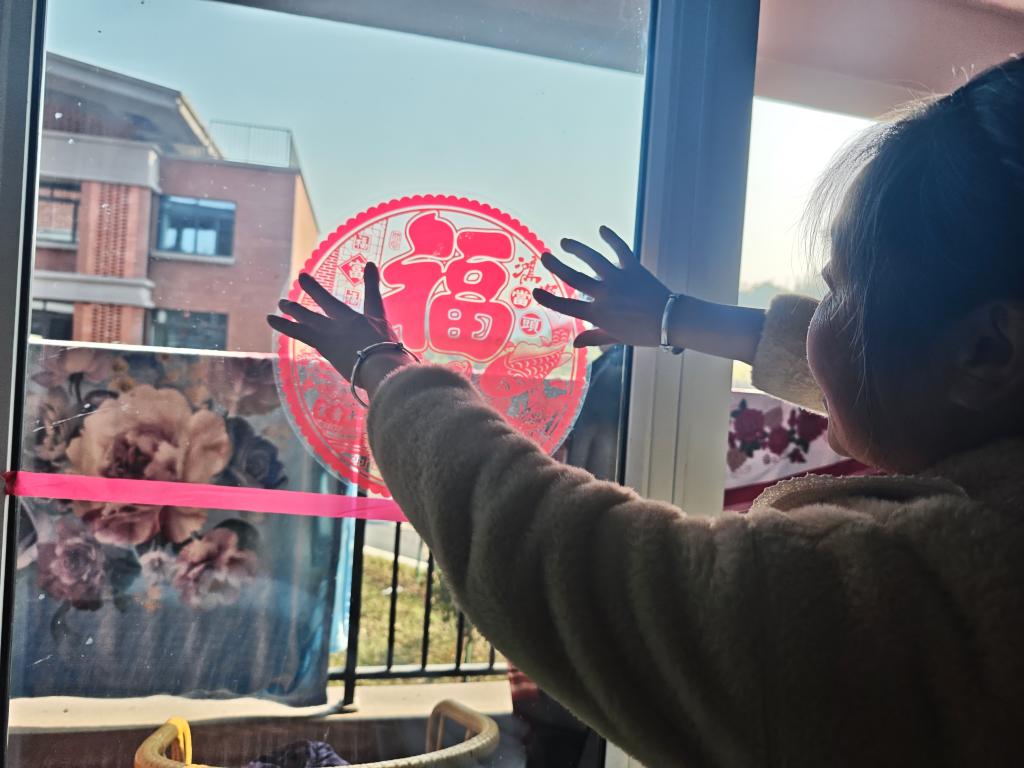 2月14日,在四川省筠连县“2·8”山体滑坡灾害集中安置区,金坪村村民舒家美正在新居张贴“福”字。周丽梅 摄
