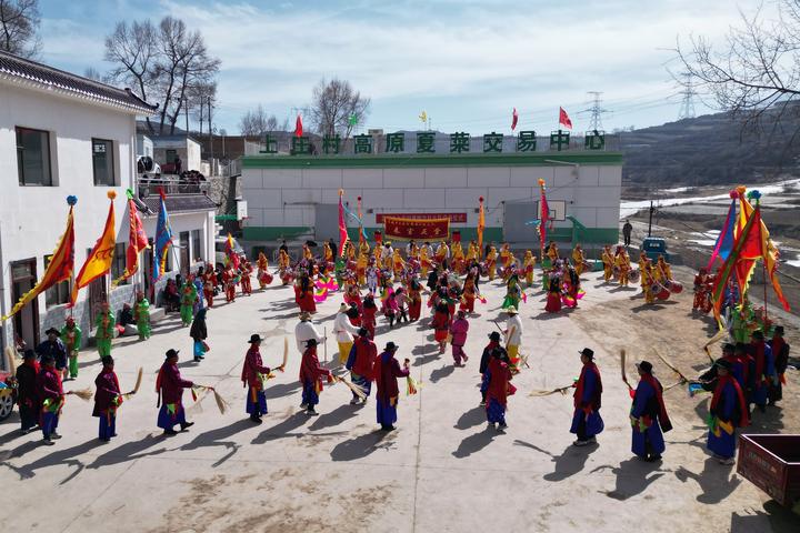 2月14日,甘肃省榆中县马坡乡上庄村鹁鸽沟社火队正在排练(无人机照片)。新华社记者 张智敏 摄