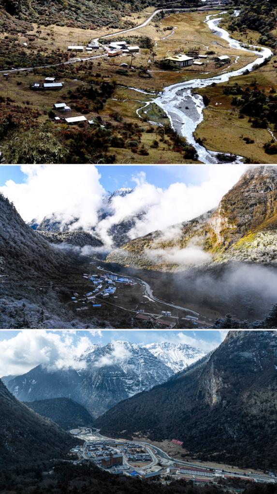 拼版照片:上图是2003年10月26日拍摄的玉麦乡(新华社记者索朗罗布摄);中图是2017年10月31日拍摄的玉麦乡(新华社记者普布扎西摄);下图是2026年2月5日拍摄的玉麦乡(无人机照片,新华社记者丁增尼达摄)。新华社发