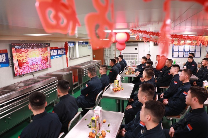 2月16日,海军衢州舰在海上执行战备巡航任务时,非当更舰员集体收看春晚。除标注外照片均为新华社记者 李秉宣 摄