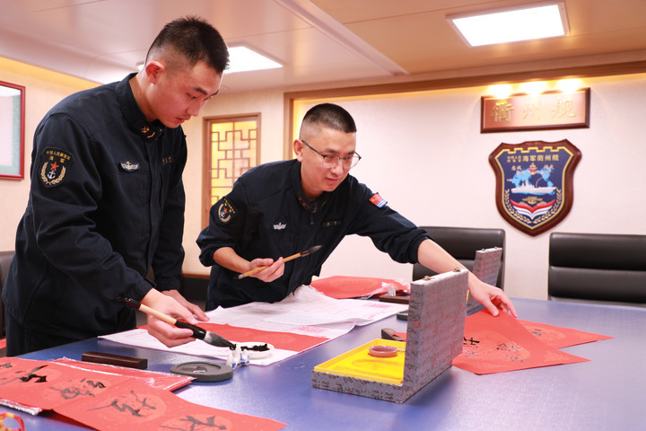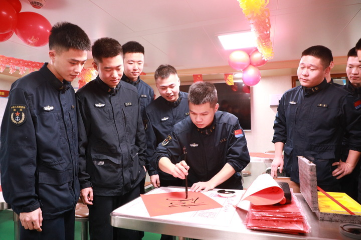 2月14日,海军衢州舰在海上执行战备巡航任务时,官兵利用休息时间写春联。