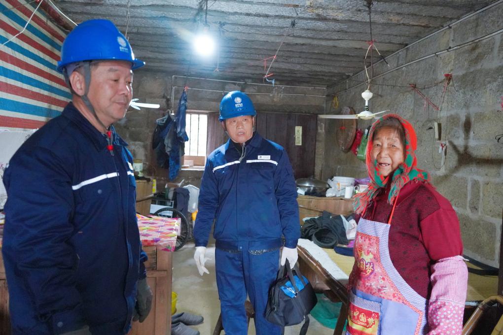 春节期间,福建平潭屿头岛电工到孤寡老人家中检修电路。新华社发