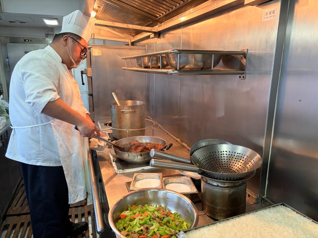 列车厨师李睿晟正在制作饭菜。新华社记者王辰阳 摄