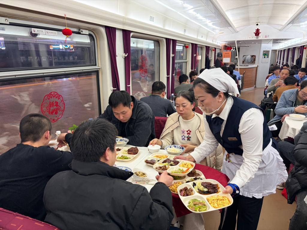 餐车服务员为乘客们端上饭菜。新华社记者王辰阳 摄