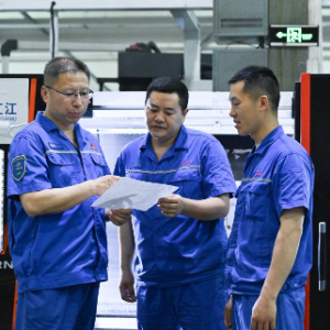 2025年5月23日,傅国涛(左一)在重庆红江机械有限责任公司生产车间与同事交流。新华社记者 王全超 摄