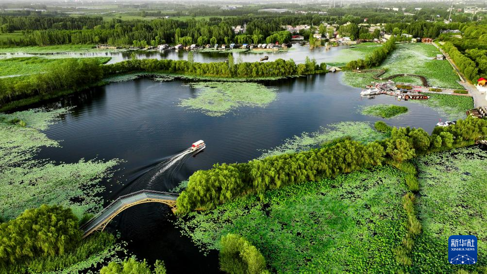 这是山东省济宁市微山县微山湖二级坝湿地公园景色(2024年8月13日摄,无人机照片)。