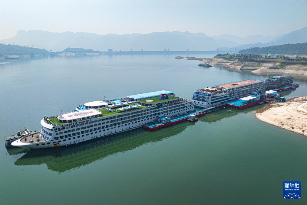 客轮停靠在湖北秭归港码头使用岸电(2024年5月23日摄,无人机照片)。湖北宜昌推进绿色航运,通过港口岸电布局建设,推广新能源船舶应用,港口告别了昔日柴油机轰鸣、众多船舶油烟四散的现象。