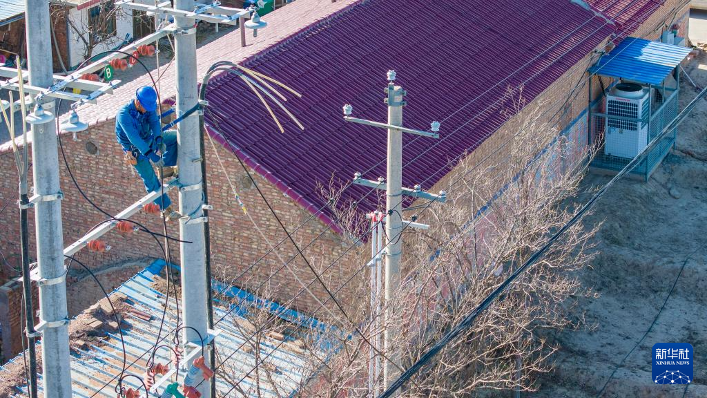 当地供电部门工作人员在宁夏吴忠市同心县河西镇旱天岭村进行“煤改电”配套供电工程施工(2025年11月27日摄,无人机照片)。