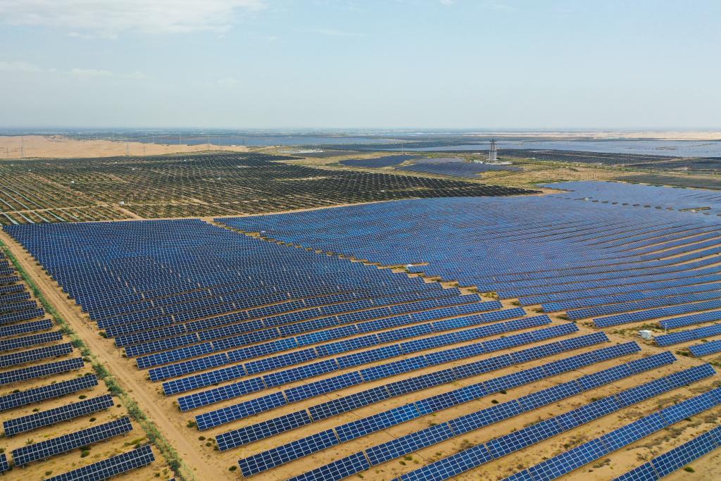 这是2025年9月10日拍摄的位于库布其沙漠的鄂尔多斯市达拉特旗光伏基地(无人机照片)。新华社记者李志鹏摄