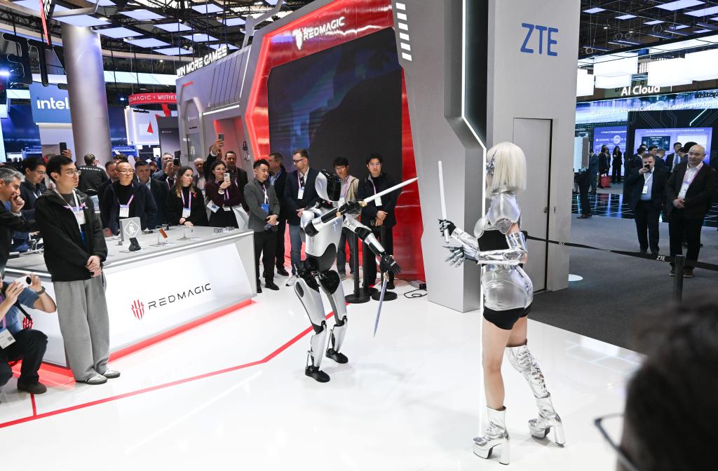3月2日,在西班牙巴塞罗那,人们在中兴通讯展台观看机器人与真人“对打”。新华社记者程敏摄