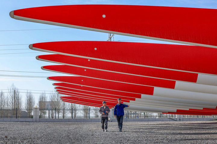 这是1月14日在甘肃省酒泉市一家企业拍摄的风电叶片。(1月14日摄)。田蹊 摄