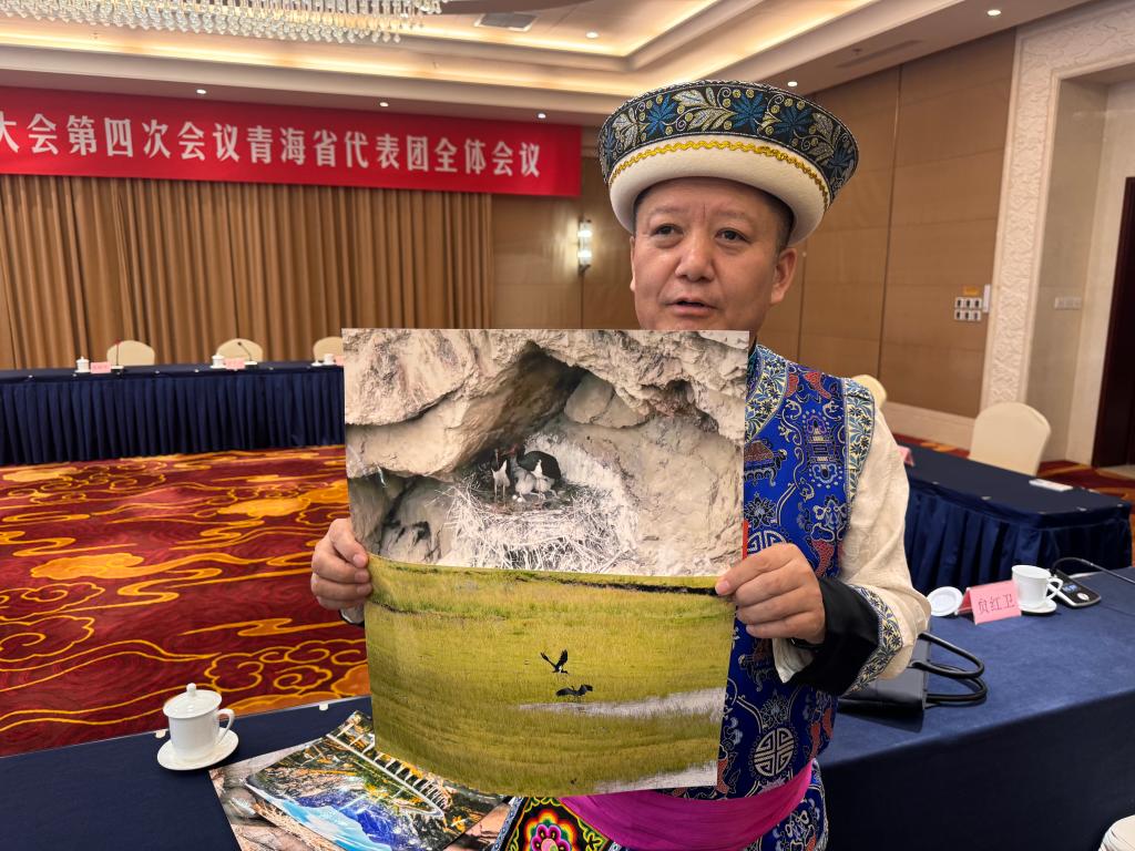 “这张照片拍摄的是一只正在孵蛋的黑鹳;这三只小雏苗是孵化出的黑鹳;这是南门峡水库周边我们的水源地,黑鹳的栖息地……”3月6日,在十四届全国人大四次会议青海代表团开放团组活动现场,全国人大代表、青海省海东市互助土族自治县委书记王国栋掏出数张照片,讲起家乡的生态故事。