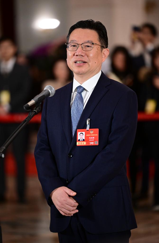 3月11日,全国政协十四届四次会议第三场“委员通道”集体采访活动在北京人民大会堂举行。这是全国政协委员刘成勇接受媒体采访。