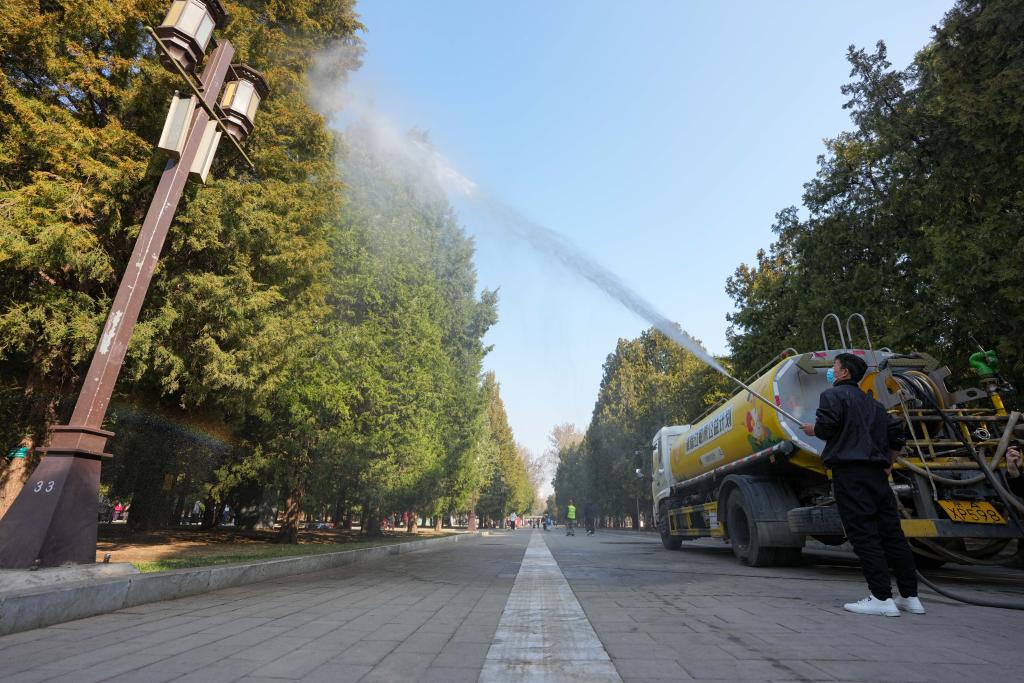 3月15日,在北京地坛公园,工作人员使用添加了花粉固定剂的水对柏树进行喷淋。新华社记者 鞠焕宗 摄