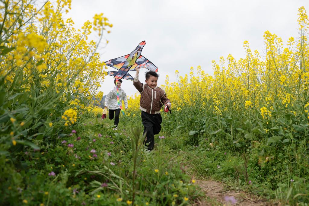 3月14日,小朋友在贵州省黔东南苗族侗族自治州一处油菜花田中放风筝。新华社发(磨桂宾摄)