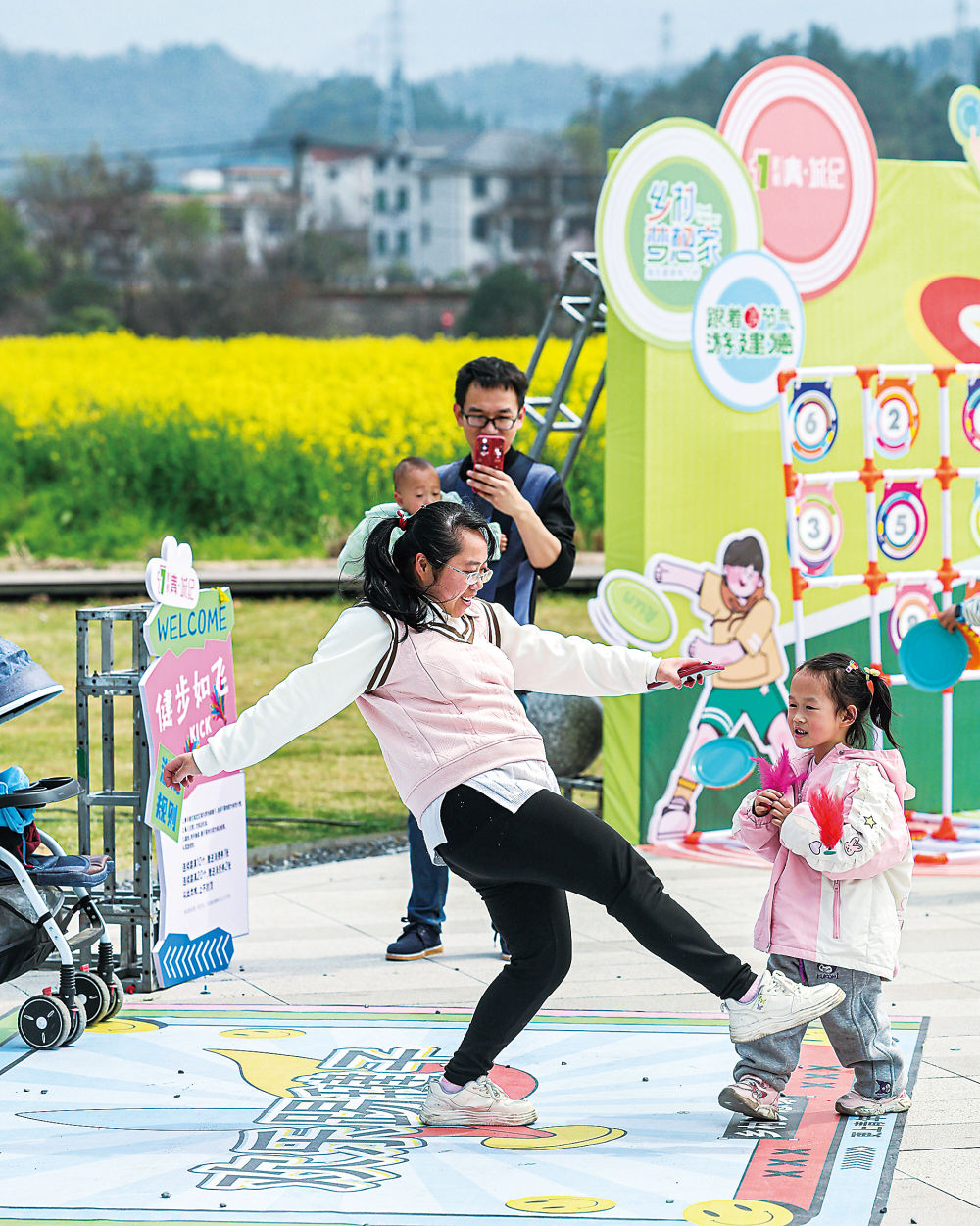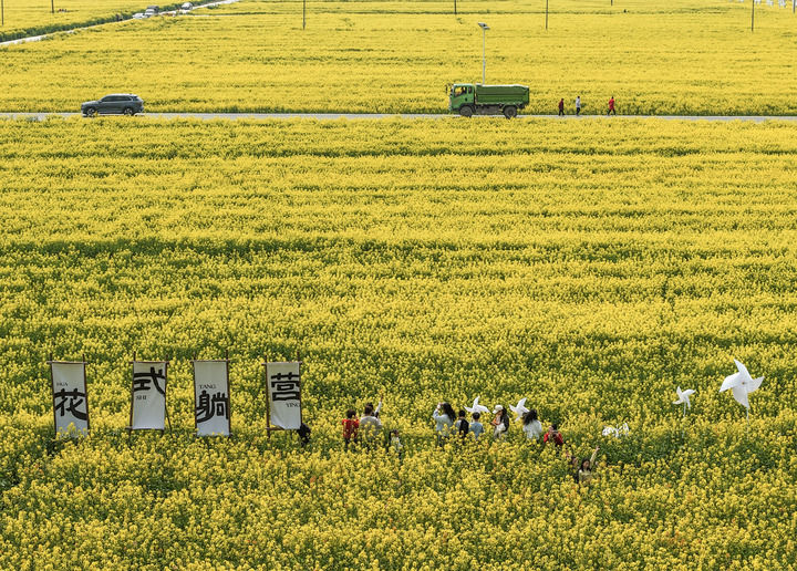 3月15日,游客在浙江建德城南城市田园油菜花田边的消费市集游玩,体验“春日经济”。新华社记者徐昱摄