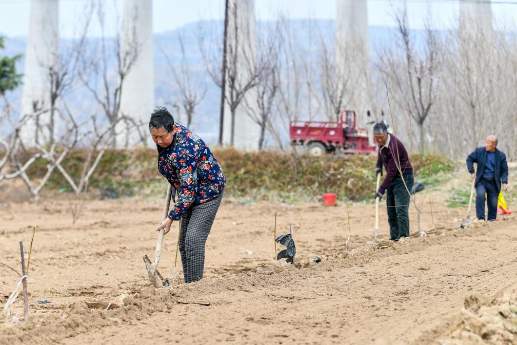 3月19日,山西省运城市平陆县张村镇的农民在种植树苗。春分到来之际,山西省运城市平陆县黄河岸边的农民抢抓农时开展春耕春管,田间地头一派忙碌景象。新华社记者 曹阳 摄