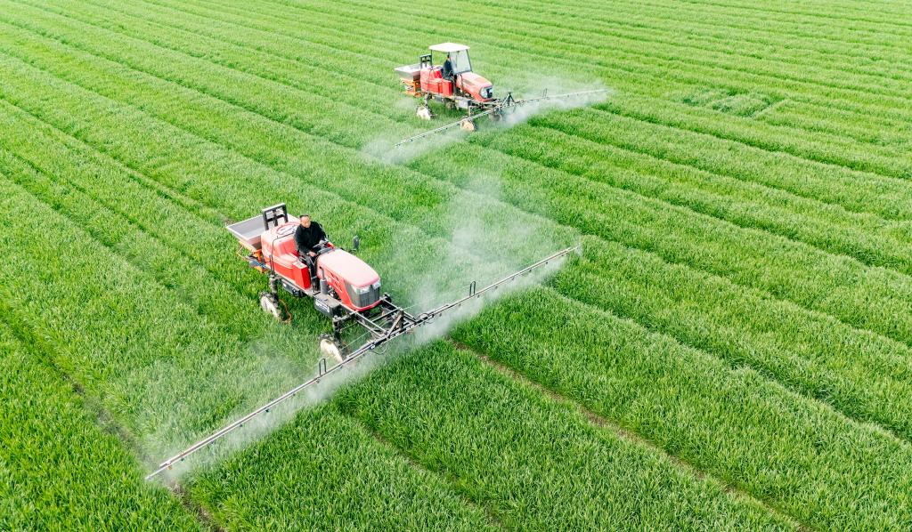 3月11日,在江苏省南通市通州区十总镇育民村,农民驾驶植保机对小麦开展田管作业(无人机照片)。新华社发(翟慧勇摄)