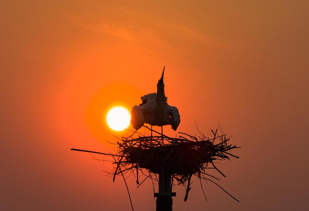 3月28日,在黑龙江省肇东市千鹤岛旅游风景区,夕阳下的东方白鹳在巢中休息(无人机照片)。新华社发(刘大鹏 摄)