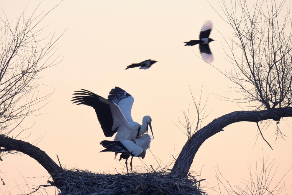 3月28日,在黑龙江省齐齐哈尔市克钦湖湿地,喜鹊从东方白鹳巢旁飞过。新华社发(王勇刚 摄)