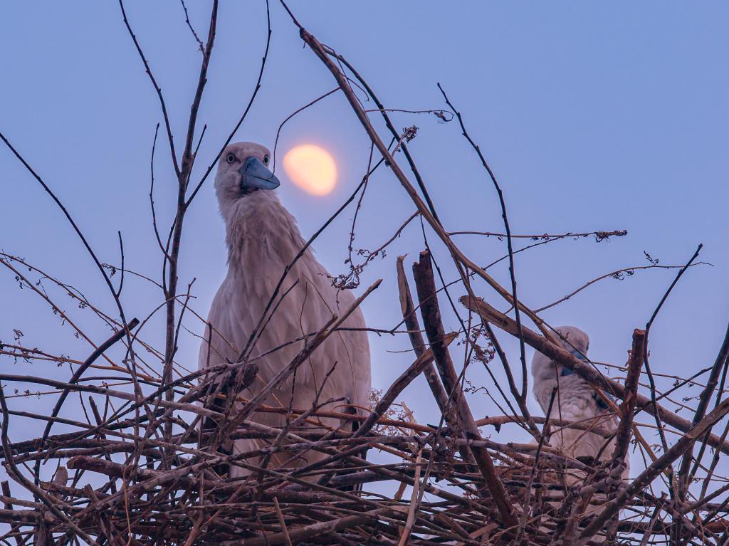 3月28日,在黑龙江省肇东市千鹤岛旅游风景区,月色下的东方白鹳在巢中休息(无人机照片)。新华社发(刘大鹏 摄)