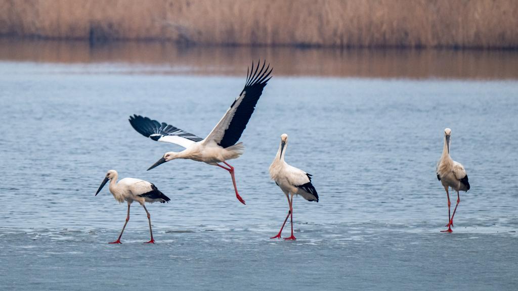3月19日,在黑龙江省哈尔滨市一处水域拍摄的东方白鹳(无人机照片)。新华社发(刘大鹏 摄)