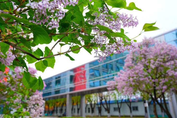 丁香掩映下的哈工大暖廊(2025年5月17日摄)。哈尔滨工业大学党委宣传部供图