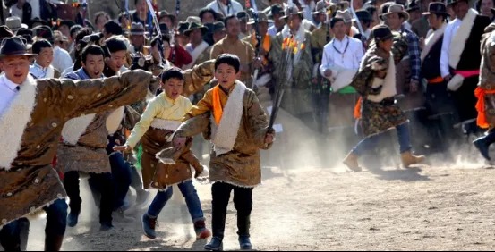 参赛选手跺脚欢呼庆祝弓箭手射中靶心。(新华网发 尼玛太 摄)