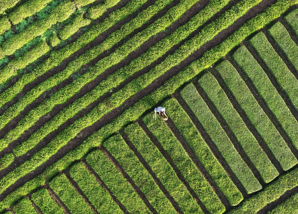4月19日,茶农在湖北省秭归县茅坪镇松树坳村一生态茶园采收雨前茶(无人机照片)。新华社发(王罡摄)