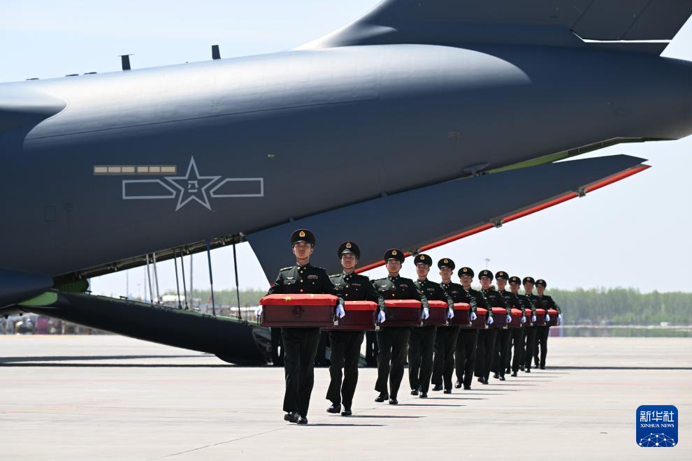 4月22日,第十三批在韩中国人民志愿军烈士遗骸由中国空军运-20B从韩国接回辽宁沈阳。这是迎回仪式上,礼兵双手捧起覆盖着五星红旗的志愿军烈士遗骸棺椁,缓步走下专机。4月22日上午,第十三批在韩中国人民志愿军烈士遗骸由中国空军运-20B从韩国接回辽宁沈阳。12位志愿军烈士英灵及146件遗物回到祖国怀抱。新华社发(余红春 摄)