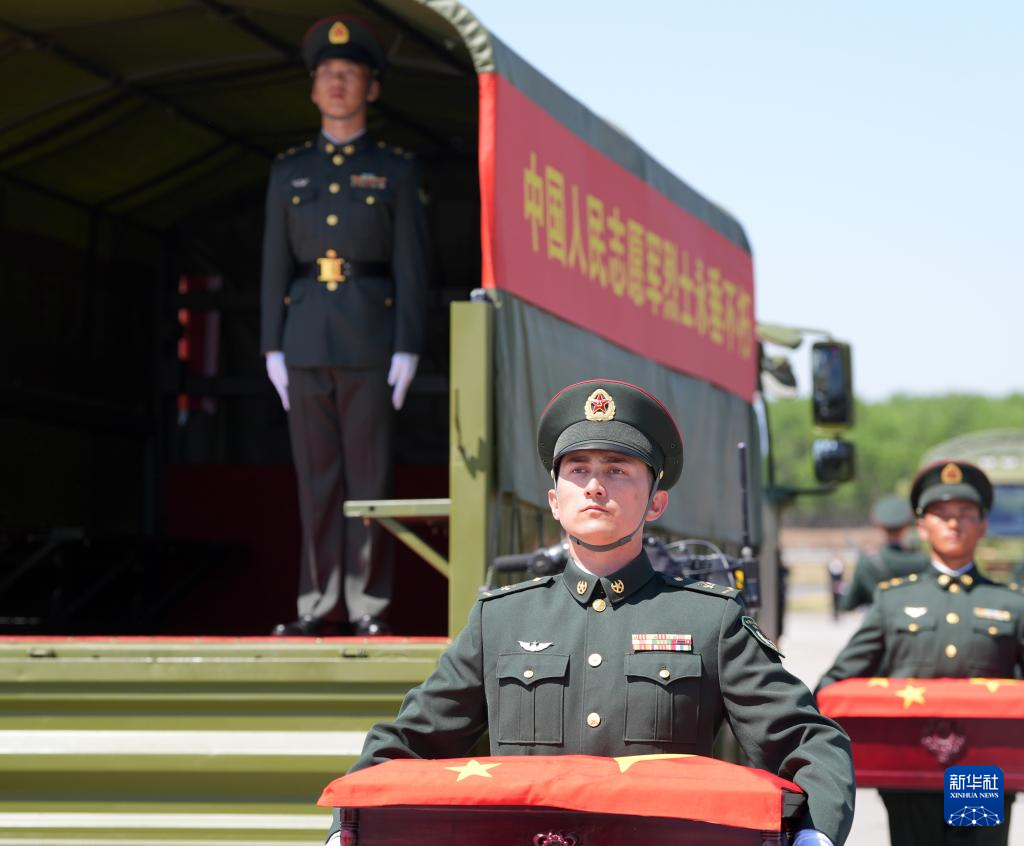 4月22日,礼兵护送志愿军烈士遗骸棺椁抵达沈阳抗美援朝烈士陵园。4月22日上午,第十三批在韩中国人民志愿军烈士遗骸由中国空军运-20B从韩国接回辽宁沈阳。12位志愿军烈士英灵及146件遗物回到祖国怀抱。新华社记者 杨青 摄