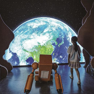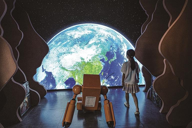 湖北武汉市,小朋友在硬科幻行星科学体验展上参观。新华社发