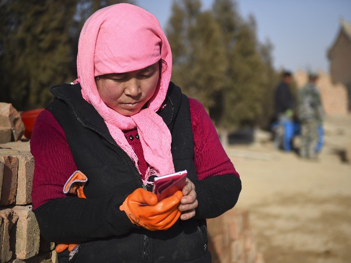这是马慧娟在工地打工间歇用手机写作(2016年3月2日摄)。新华社记者 王鹏 摄