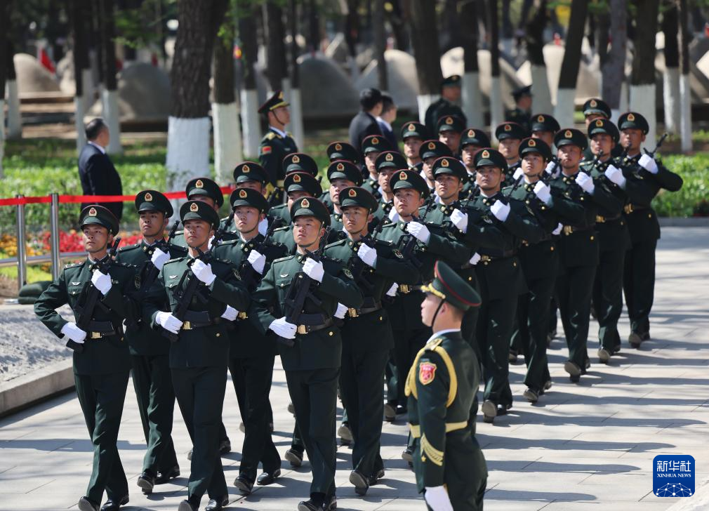 4月23日,在沈阳抗美援朝烈士陵园,礼兵整齐列队。新华社记者 李钢 摄