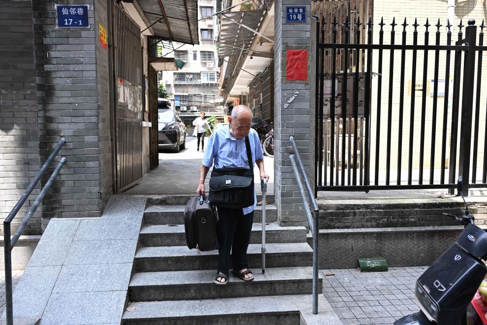 ↑4月19日,林宝山拉着行李箱走在去摆摊的路上。