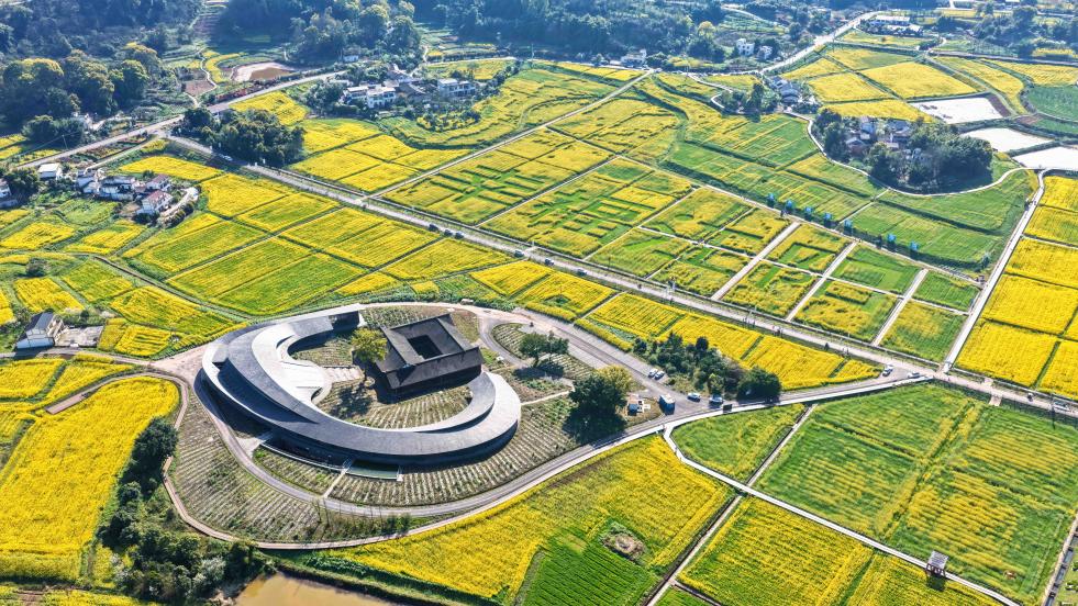 在四川省泸州市江阳区分水岭镇董允坝现代农业园区拍摄的油菜花田(3月4日摄,无人机照片)。新华社发(刘学懿摄)