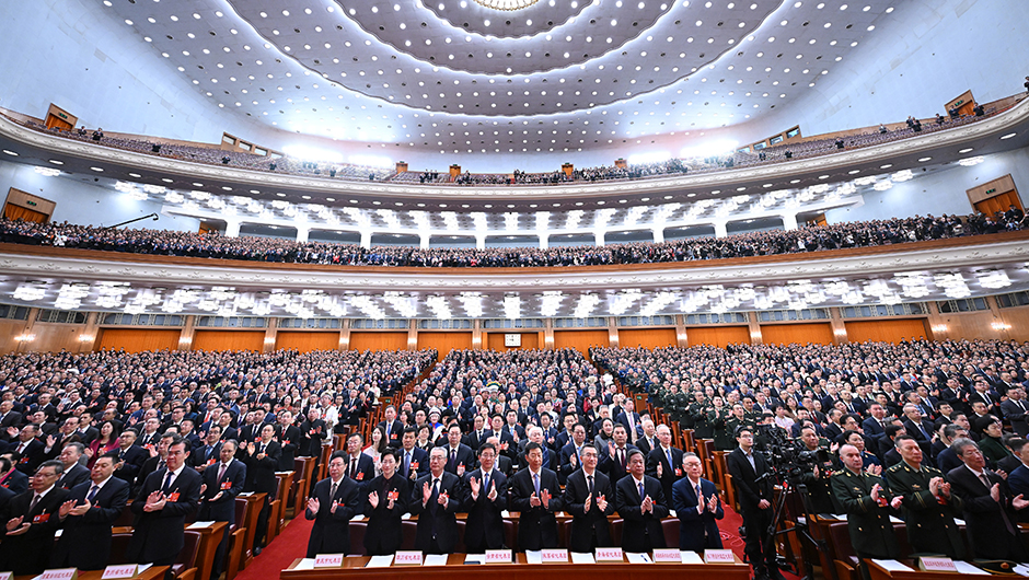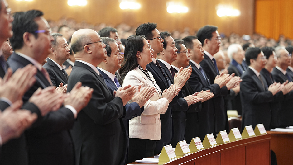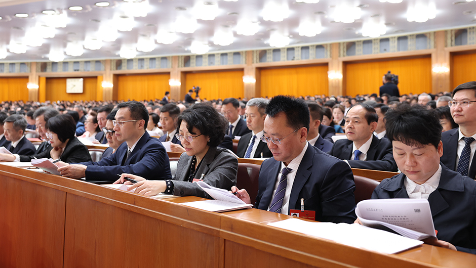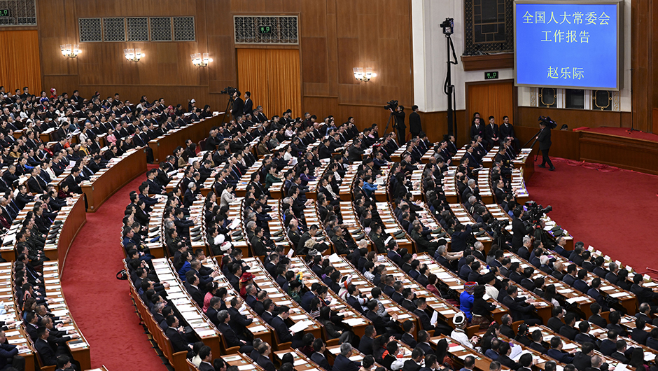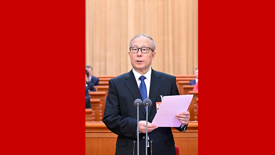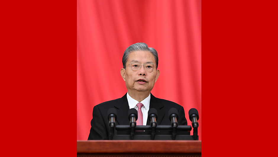 受全国人大常委会委托,赵乐际委员长向大会报告全国人大常委会工作